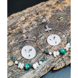 Créoles en ivoire végétal et acier inoxydable représentant des pailles-en-queue ornés de pierres naturelles*. (*en photo : Hématite, Malachite et...