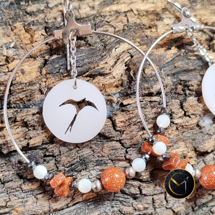 • Boucles d'oreilles créoles paille-en-queue en ivoire végétal, pierres naturelles Hématite, nacre, pierre du soleil et acier inox