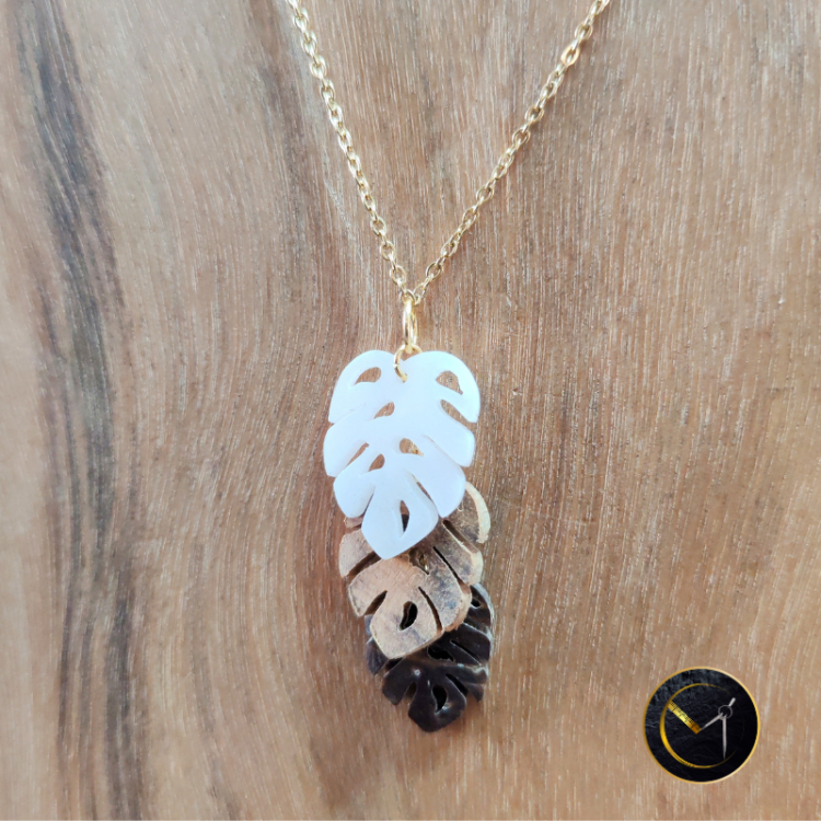 Collier en feuille de monsteras tri-matières, ivoire végétal, tamarin, coque de coco et acier inoxydable.